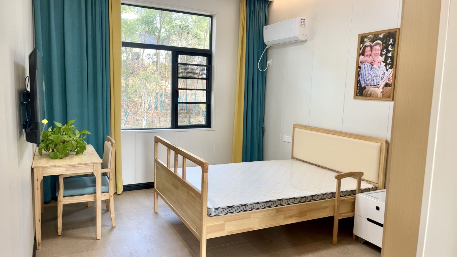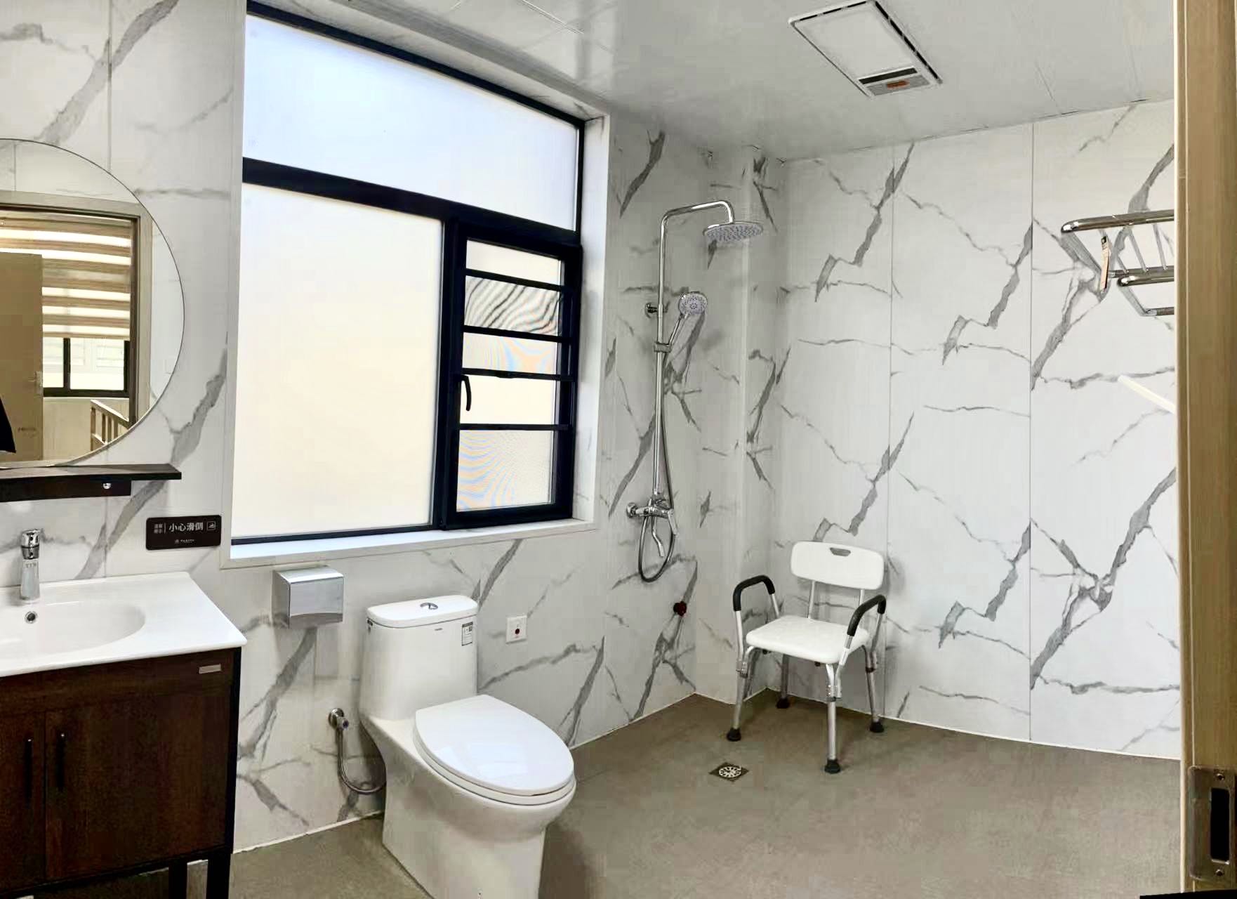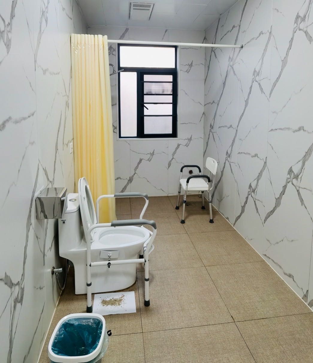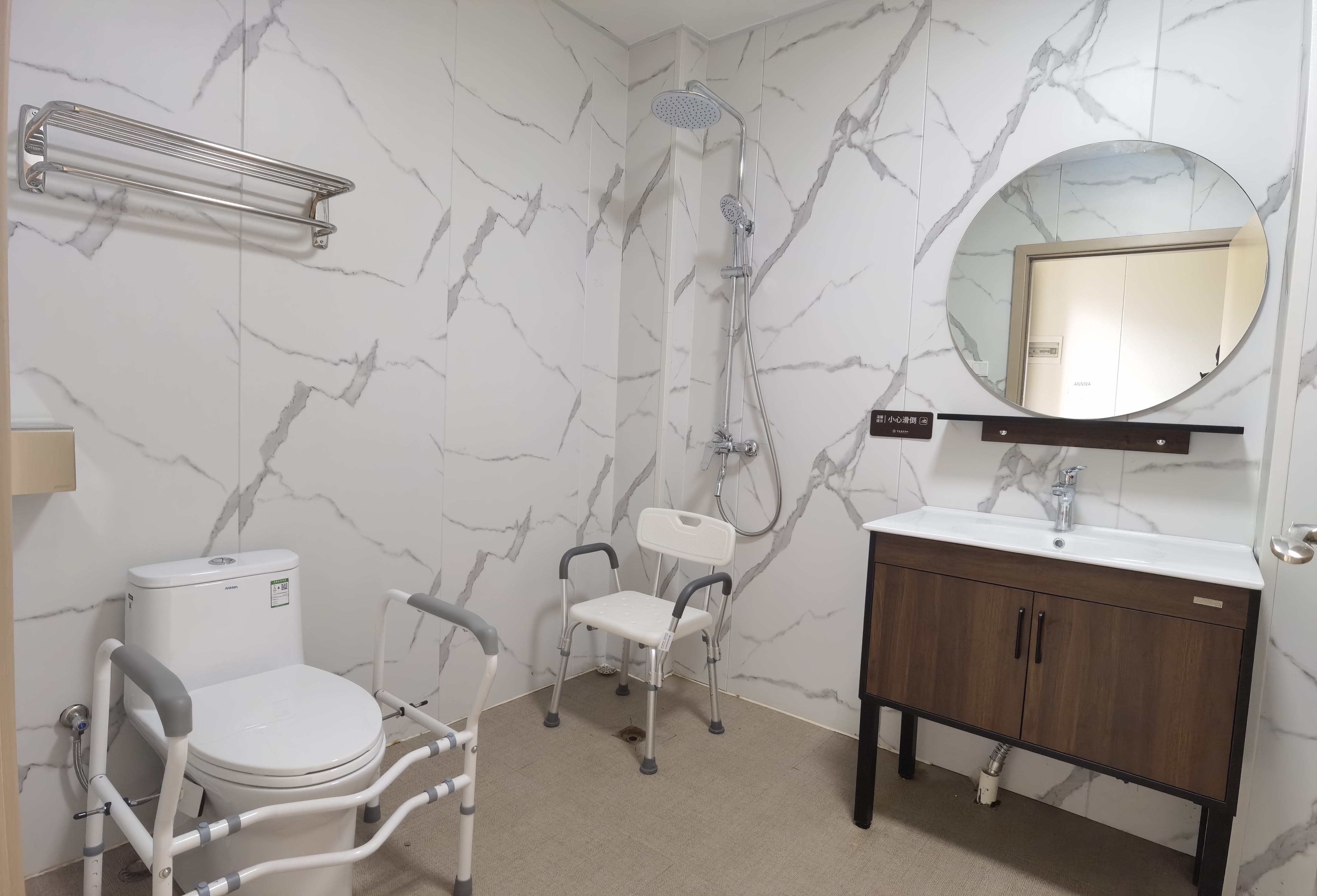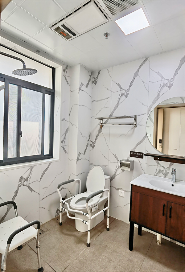 衛(wèi)生間的馬桶配有防護(hù)設(shè)施,能保證長者的安全,房間其他配套設(shè)施齊全,就像自己的家一樣溫馨。